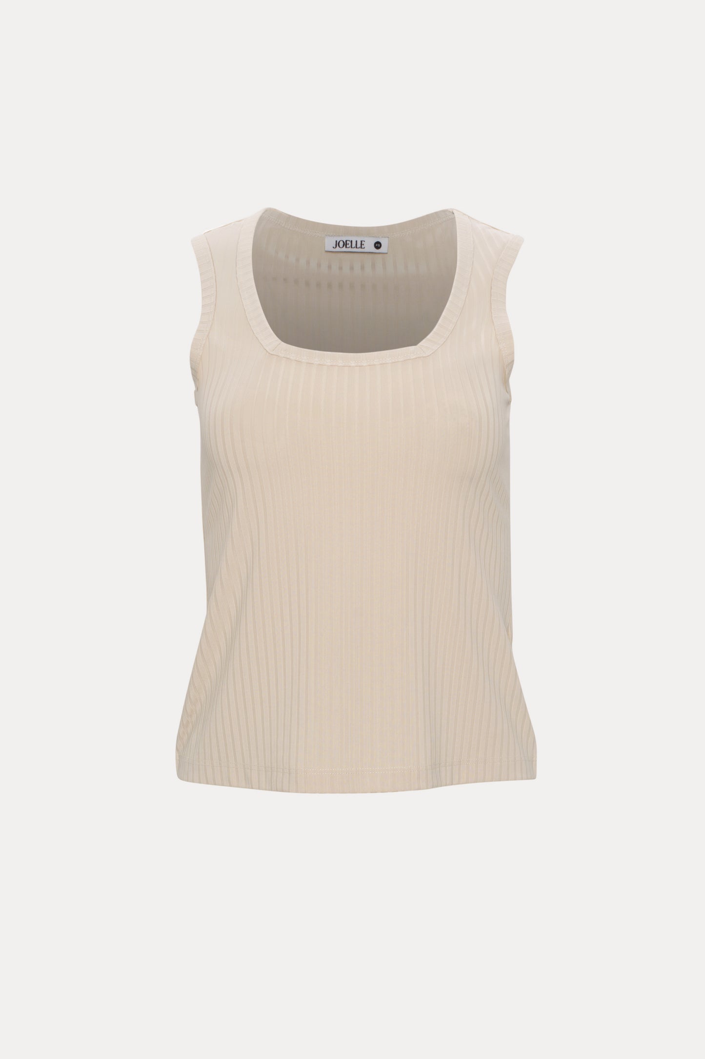 Ayliya , the beige ribbed camisole, has a flattering effect with its fitted and cropped cut, and unique with its neckline. Ayliya is a wear-with-everything essential.