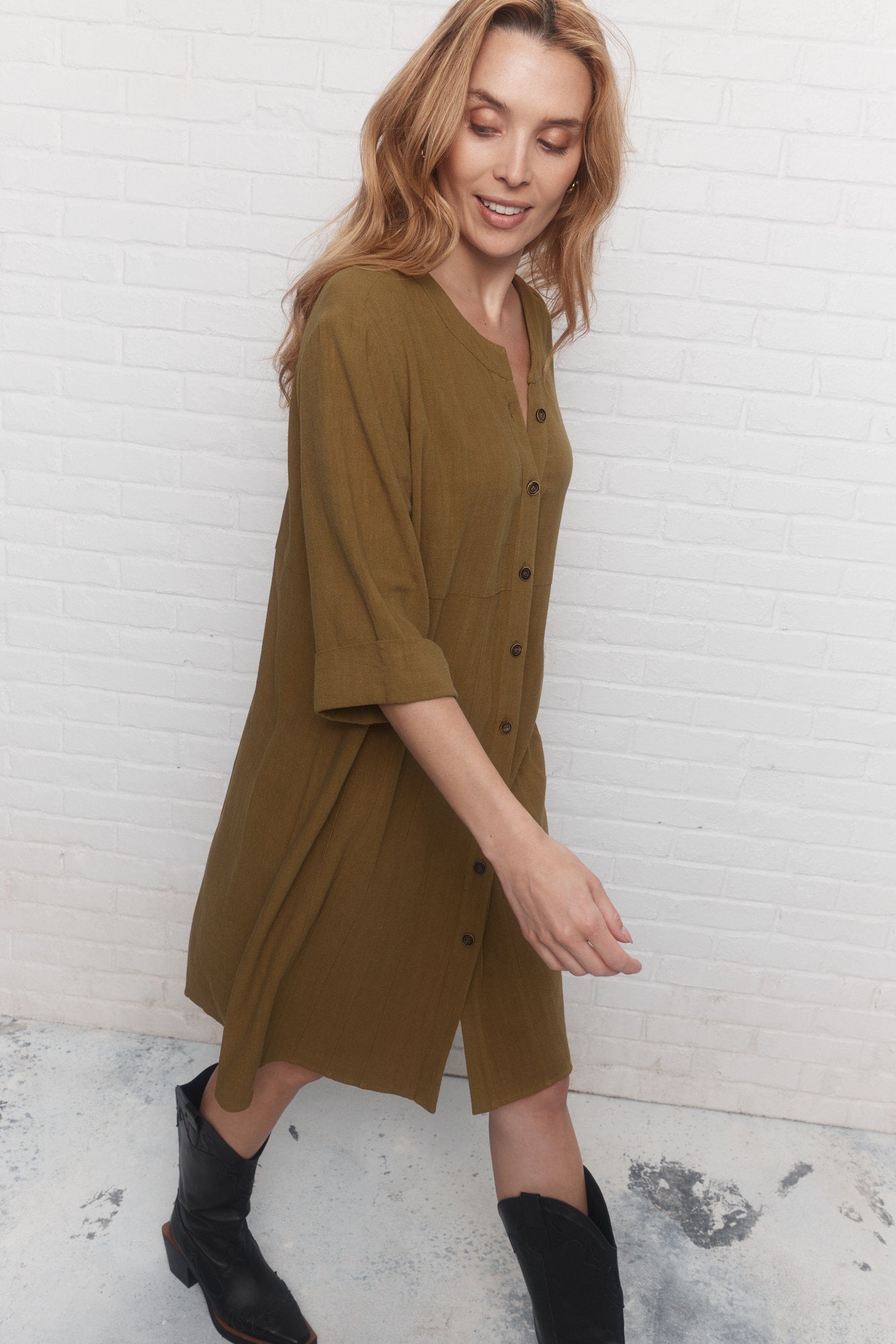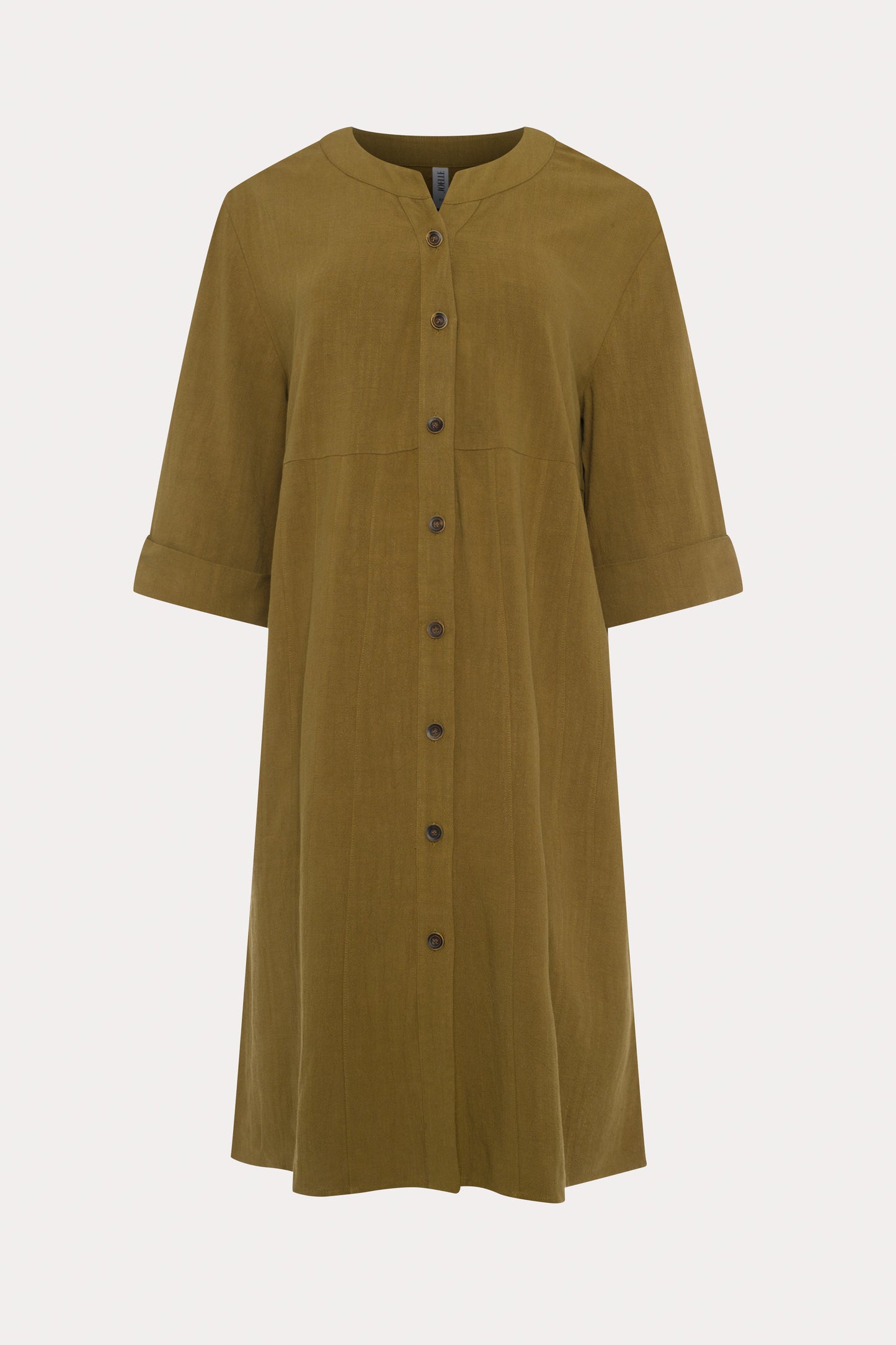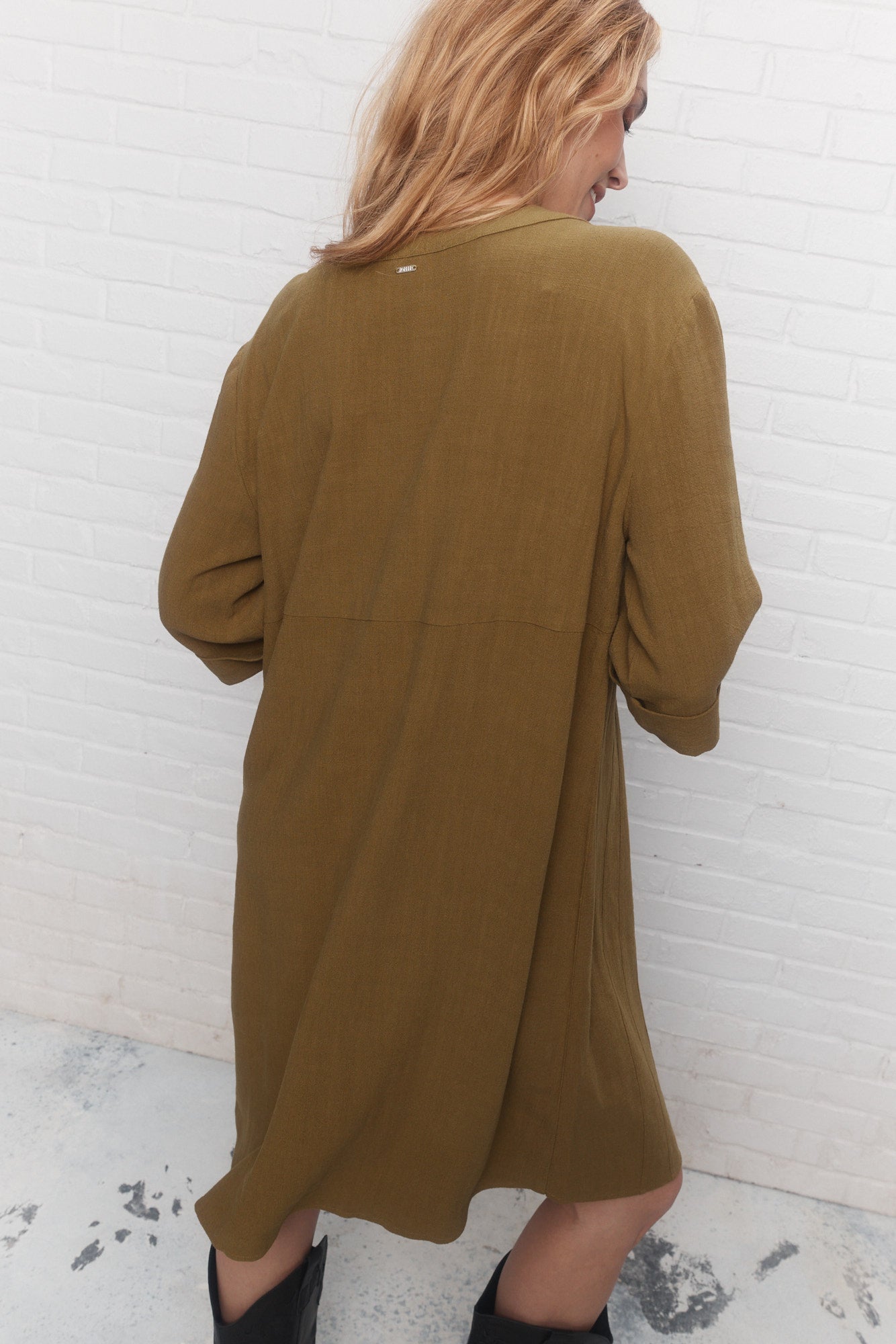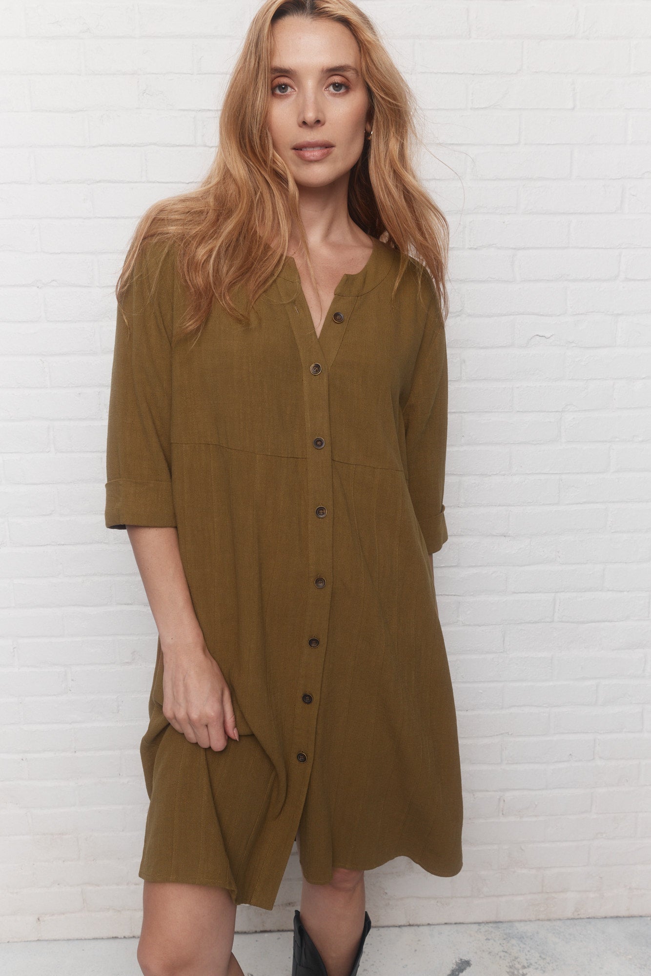 The khaki green Paseo shirt dress, flowing and loose, balances lightness and structure with its slit collar and rolled-up sleeves.