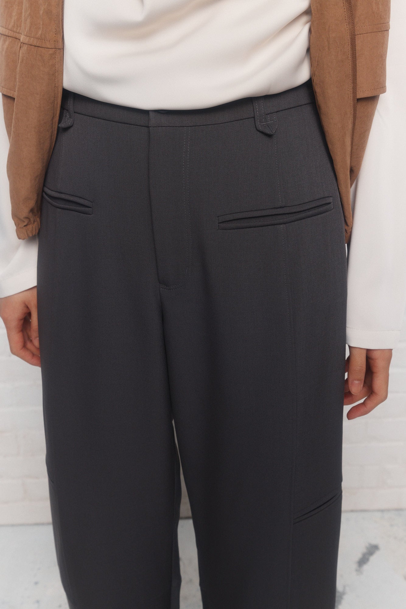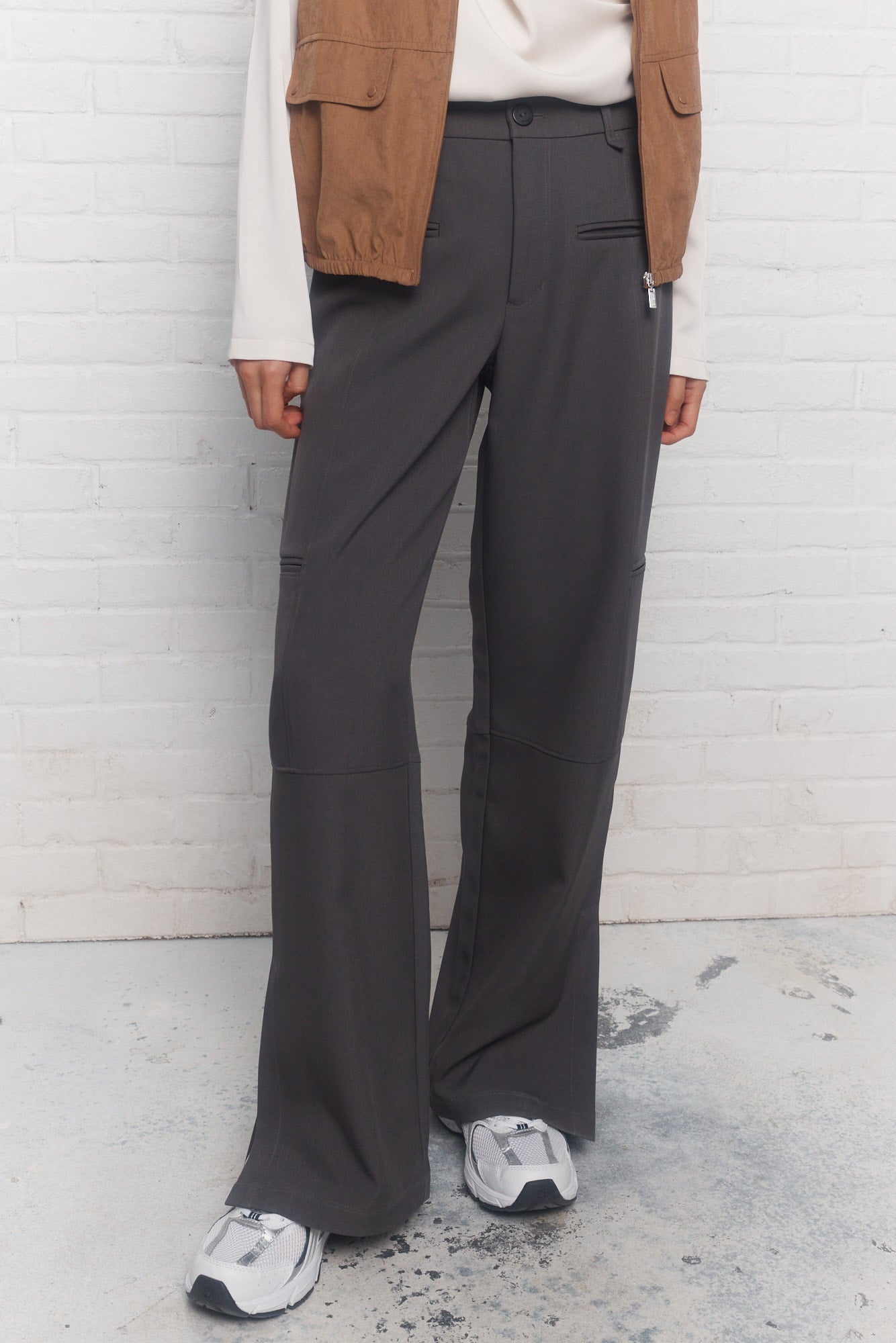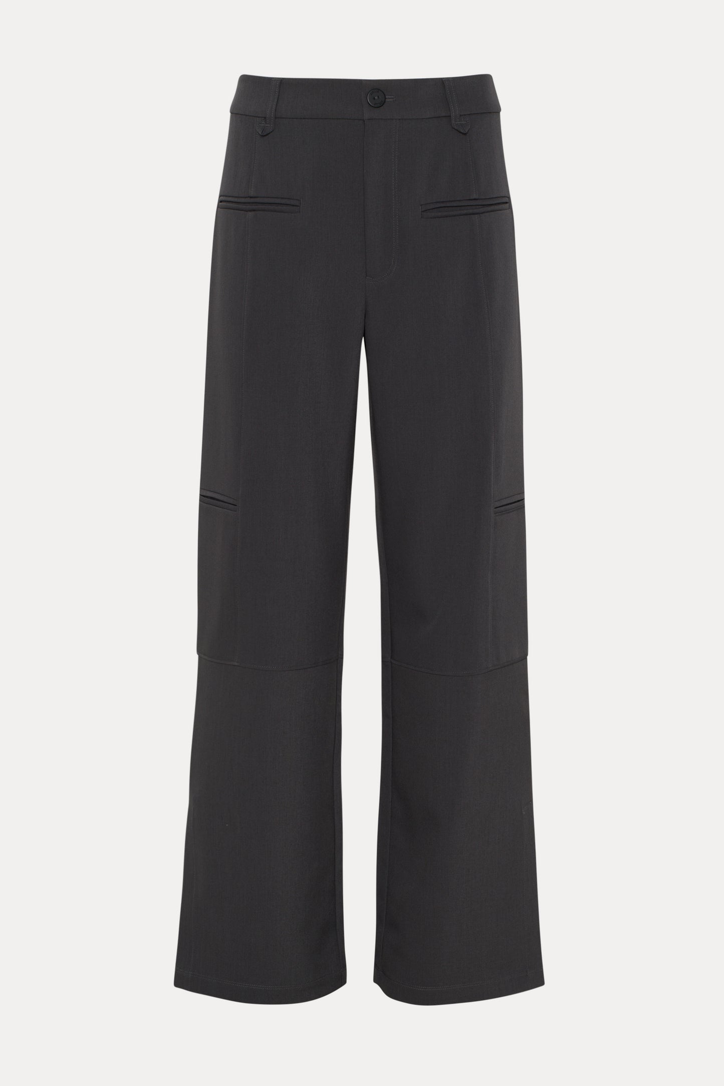 - Mid-rise, waistband with belt loops, button and zipper closure at the front