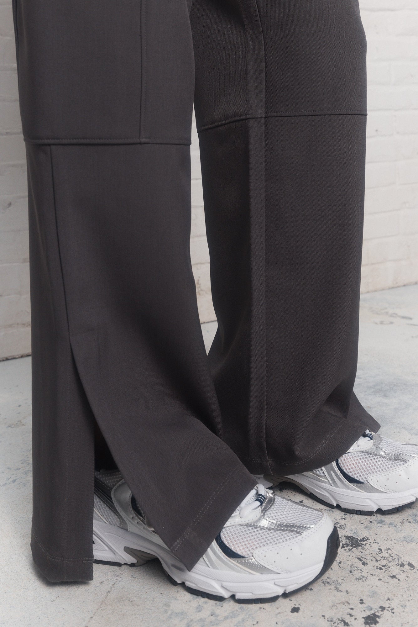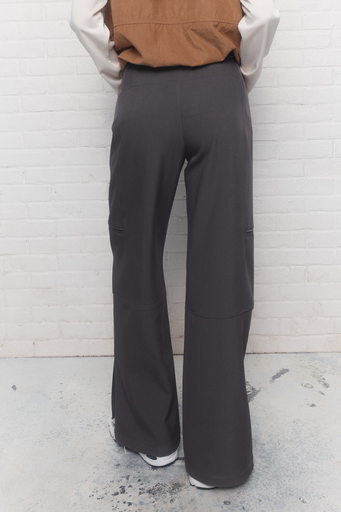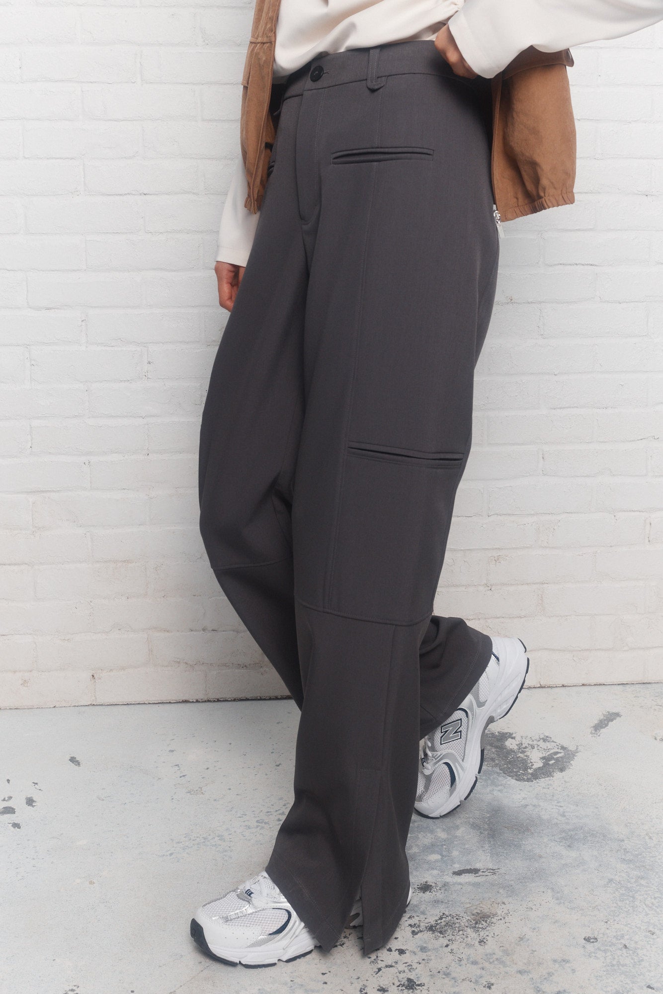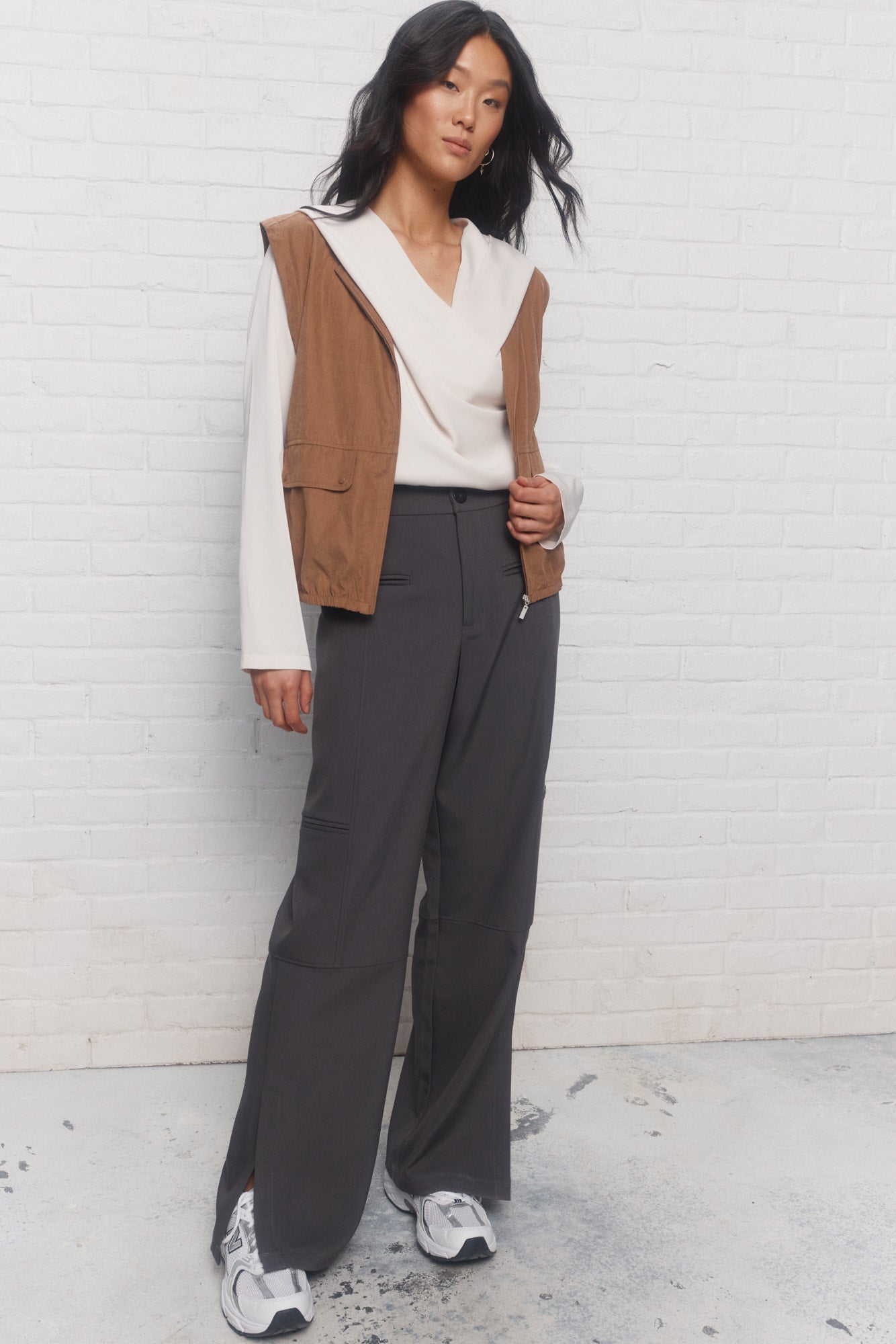 - Mid-rise, waistband with belt loops, button and zipper closure at the front