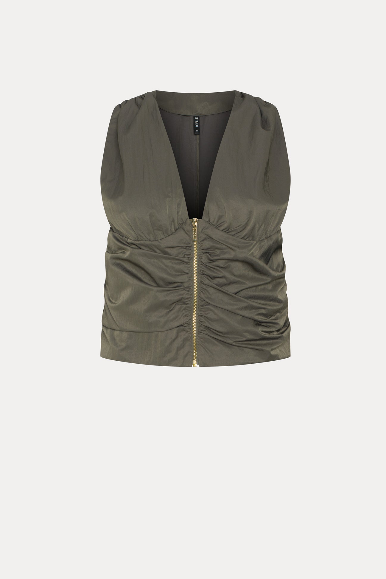 Avec sa fermeture à glissière dorée et ses fronces bien placées, la camisole kaki Demure structure la silhouette sans la contraindre. Son col plongeant et ses bretelles larges en font une pièce forte, facile à porter.