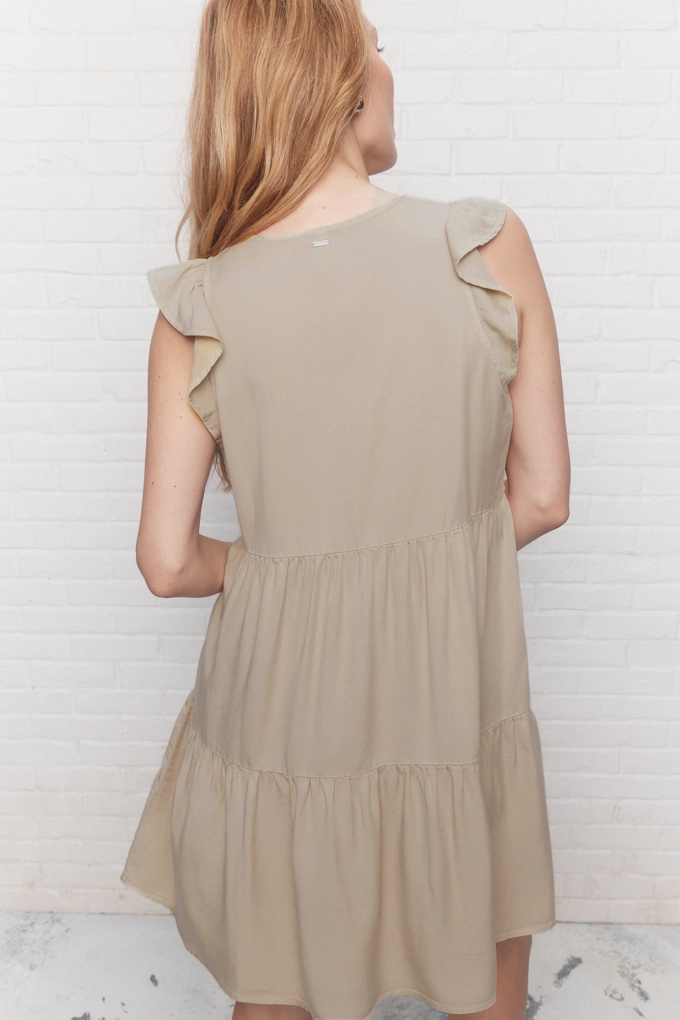 Baladez-vous en douceur avec la robe beige Draco. Sa coupe ample et son encolure en V offrent une fluidité de mouvement et un confort inégalé, idéal pour les chaudes journées d'été. Délicates et légères, les petites manches à volants à l'épaule et les fronces à la taille et aux hanches ajouteront une touche romantique à votre style.
